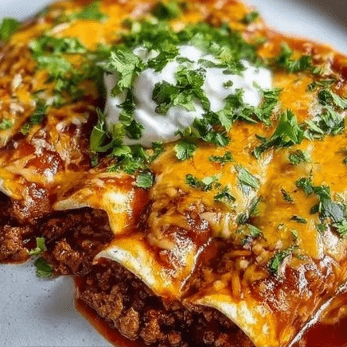 Savory ground beef enchiladas with melty cheese and a flavorful filling, perfect for a comforting Mexican-inspired meal.