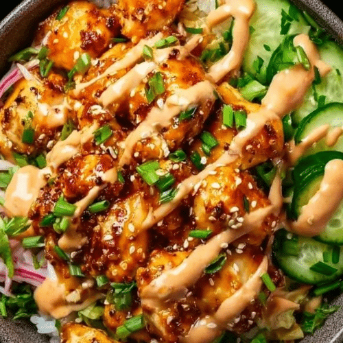 If you’re looking for a meal that combines crispy chicken, creamy, spicy sauce, and fresh vegetables over a bed of fluffy rice, the Bang Bang Chicken Bowl is your answer. Inspired by the flavors of Asian cuisine, this dish delivers a perfect balance of textures and flavors: crunchy chicken, tender rice, crisp veggies, and a spicy-sweet sauce that ties everything together.