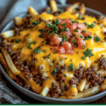 - Bake for 25–30 minutes until fries are crispy and cheese is melted.