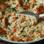 A creamy and comforting chicken pot pie-inspired orzo dish with tender chicken, vegetables, and a rich sauce—perfect for weeknight dinners.