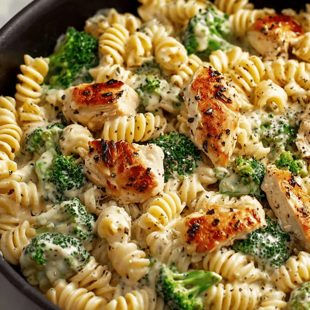 The pasta is coated in a rich, creamy sauce made from heavy cream, chicken broth, and a blend of cheeses, creating a smooth and velvety texture. Broccoli adds freshness, color, and a light crunch that balances the richness of the sauce. Together, these ingredients form a complete, satisfying meal in one bowl.