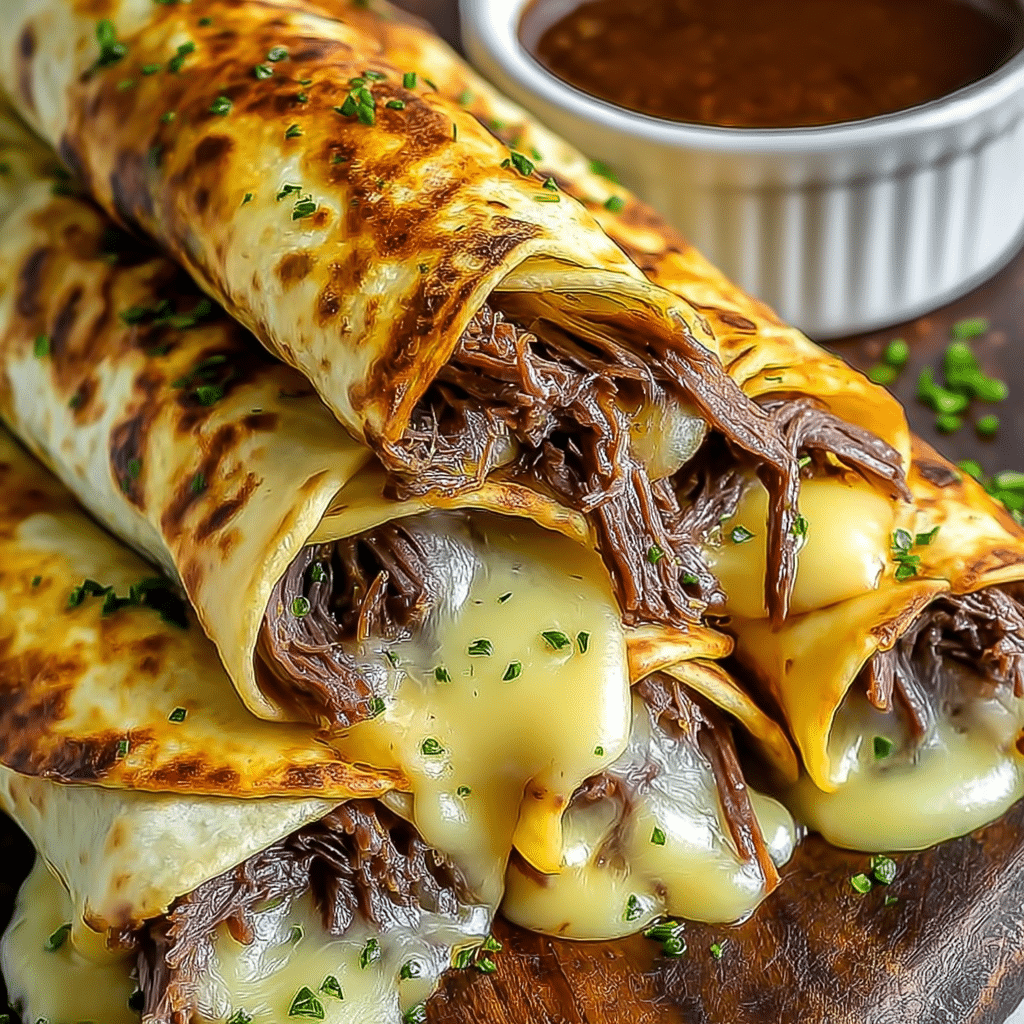 This recipe is perfect for busy weeknights, game day snacks, party appetizers, or even a creative family dinner. Instead of using bread rolls, soft flour tortillas are tightly wrapped around layers of beef and cheese, then baked until golden and crisp. The result is a warm, melty, and satisfying roll-up that pairs perfectly with a flavorful beef dipping broth.