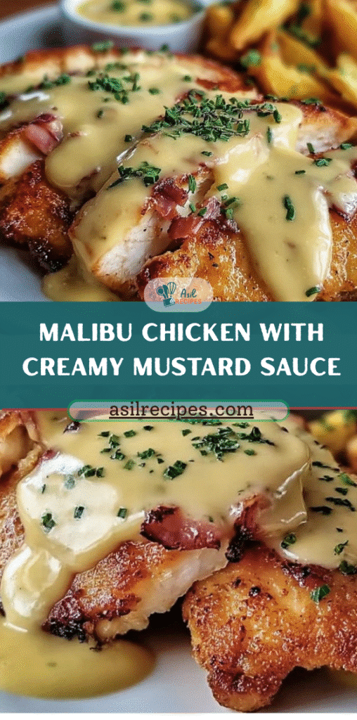 Perfect for weeknight dinners, casual gatherings, or even special occasions, Malibu Chicken delivers a satisfying combination of textures and flavors: the crispy breading contrasts with tender chicken, the salty-sweet ham complements the creamy cheese, and the mustard sauce adds a tangy richness that ties the dish together.