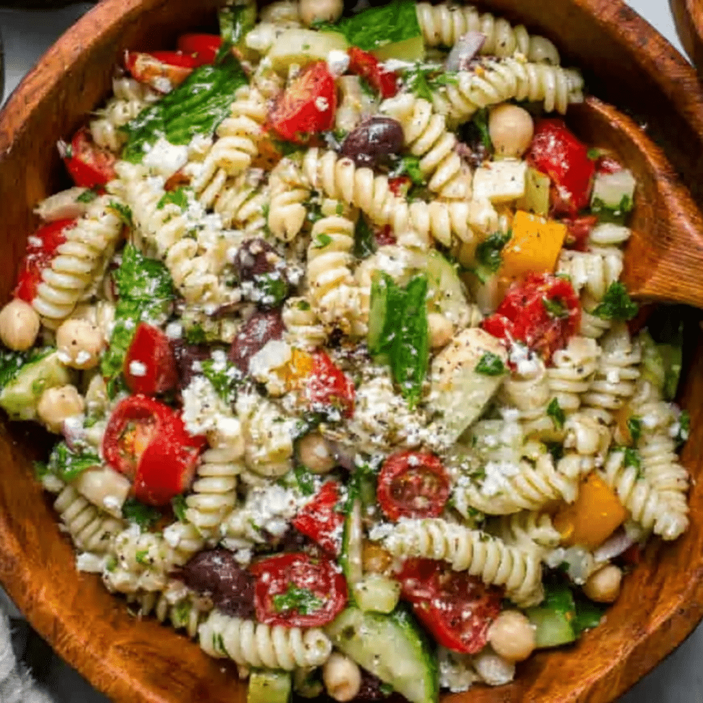 - Loaded with texture and color – Every bite has something different: creamy chickpeas, juicy tomatoes, crisp peppers, briny olives, tender pasta, and two kinds of cheese.