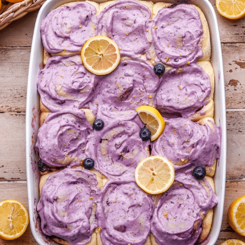 Soft, fluffy lemon rolls with gooey lemon sugar filling and blueberry jam, topped with lemon blueberry cream cheese frosting. Perfect for breakfast or dessert!