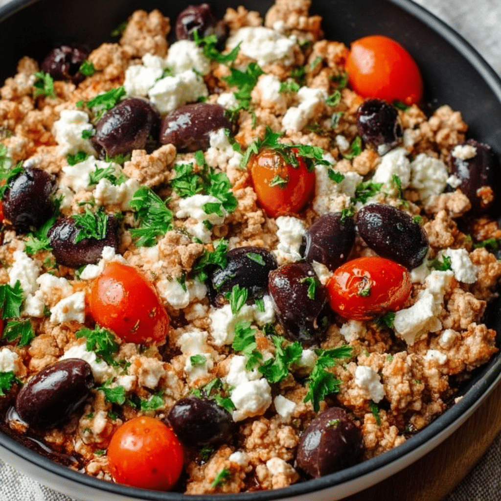 A vibrant, healthy, and flavorful skillet meal packed with juicy ground chicken, briny olives, tangy feta, and fresh vegetables — perfect for keto and gluten-free diets.