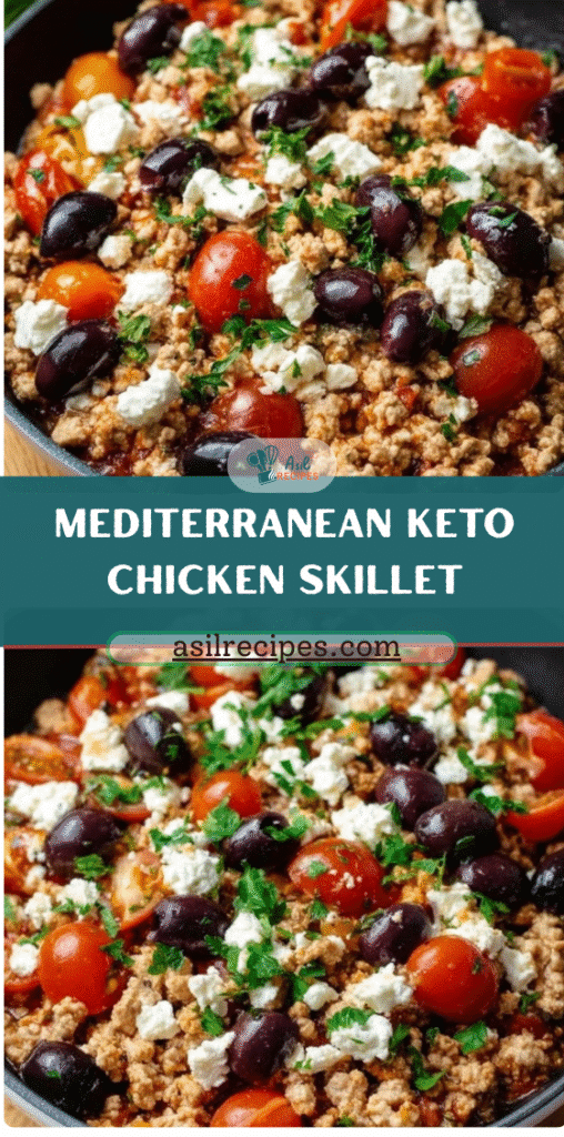 A vibrant keto-friendly skillet with ground chicken, olives, feta, fresh veggies, and Mediterranean spices — perfect for a healthy, quick dinner.